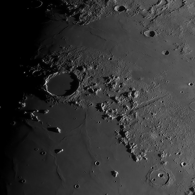 Восточнее Карпат, отделенные от них проливом, поднимаются самые величественные лунные горы - Апеннины. Кстати, обратите внимание на кратерные цепочки, переходящие в борозды в этом проливе (Борозды Стадия) - они особенно хорошо видны при невысоком положениии Солнца.
