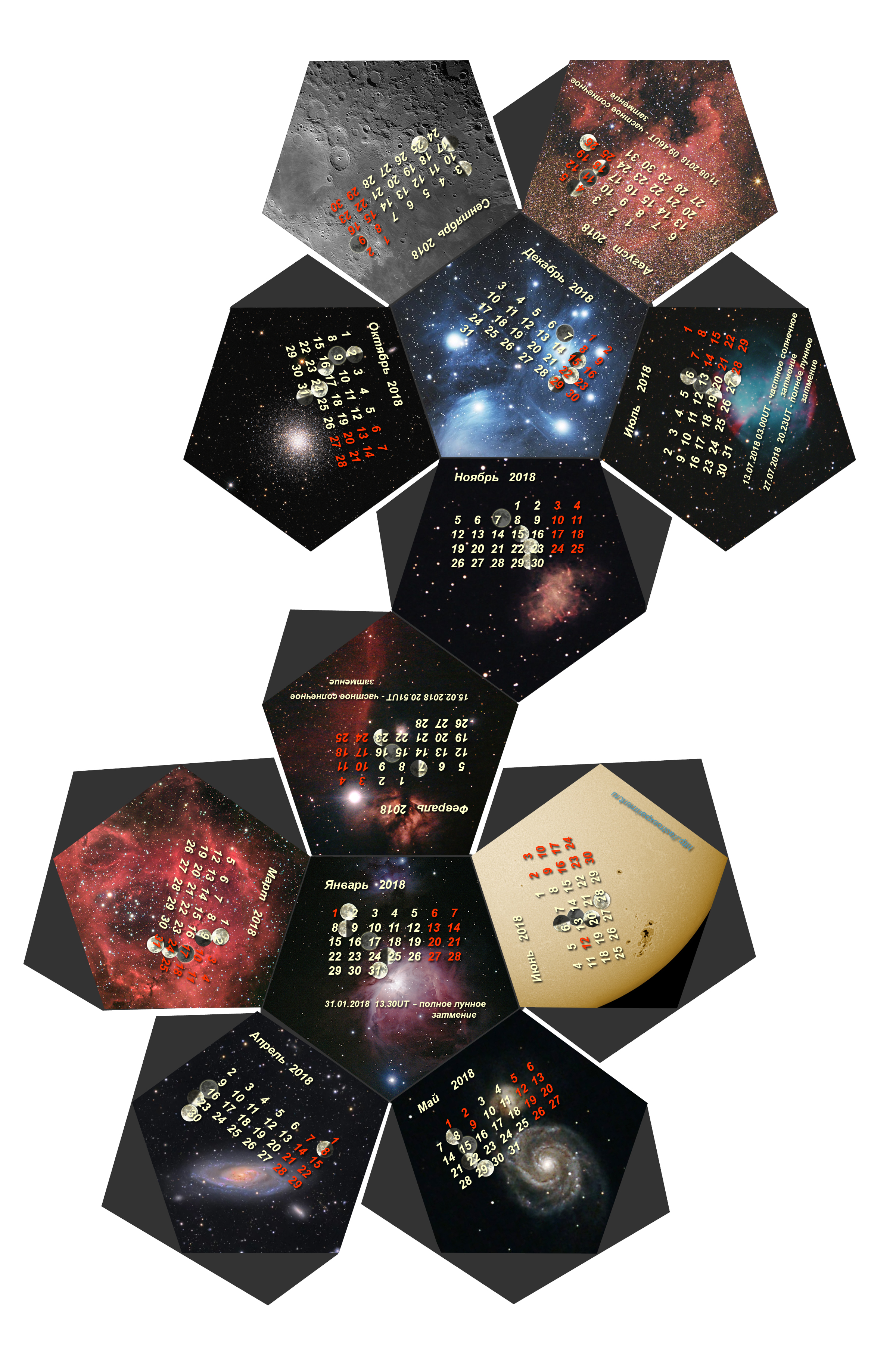 На календаре отмечены фазы Луны и моменты солнечных и лунных затмений (точнее, моменты максимальной фазы этих явлений по всемирному времени).